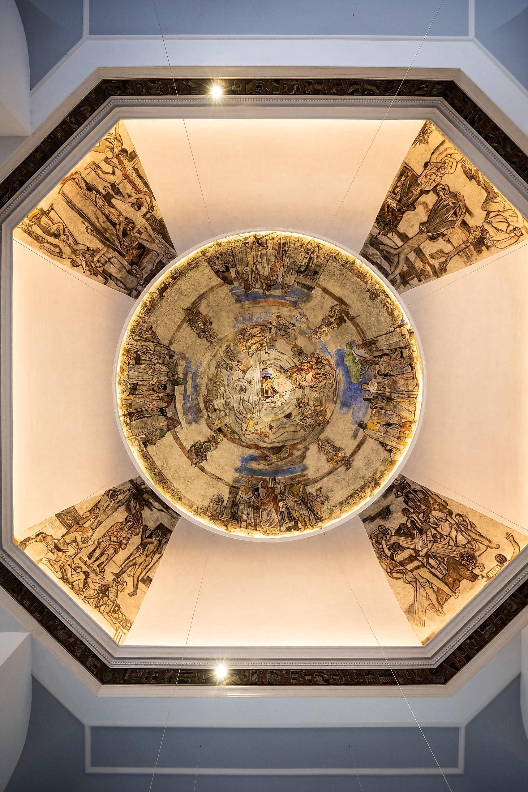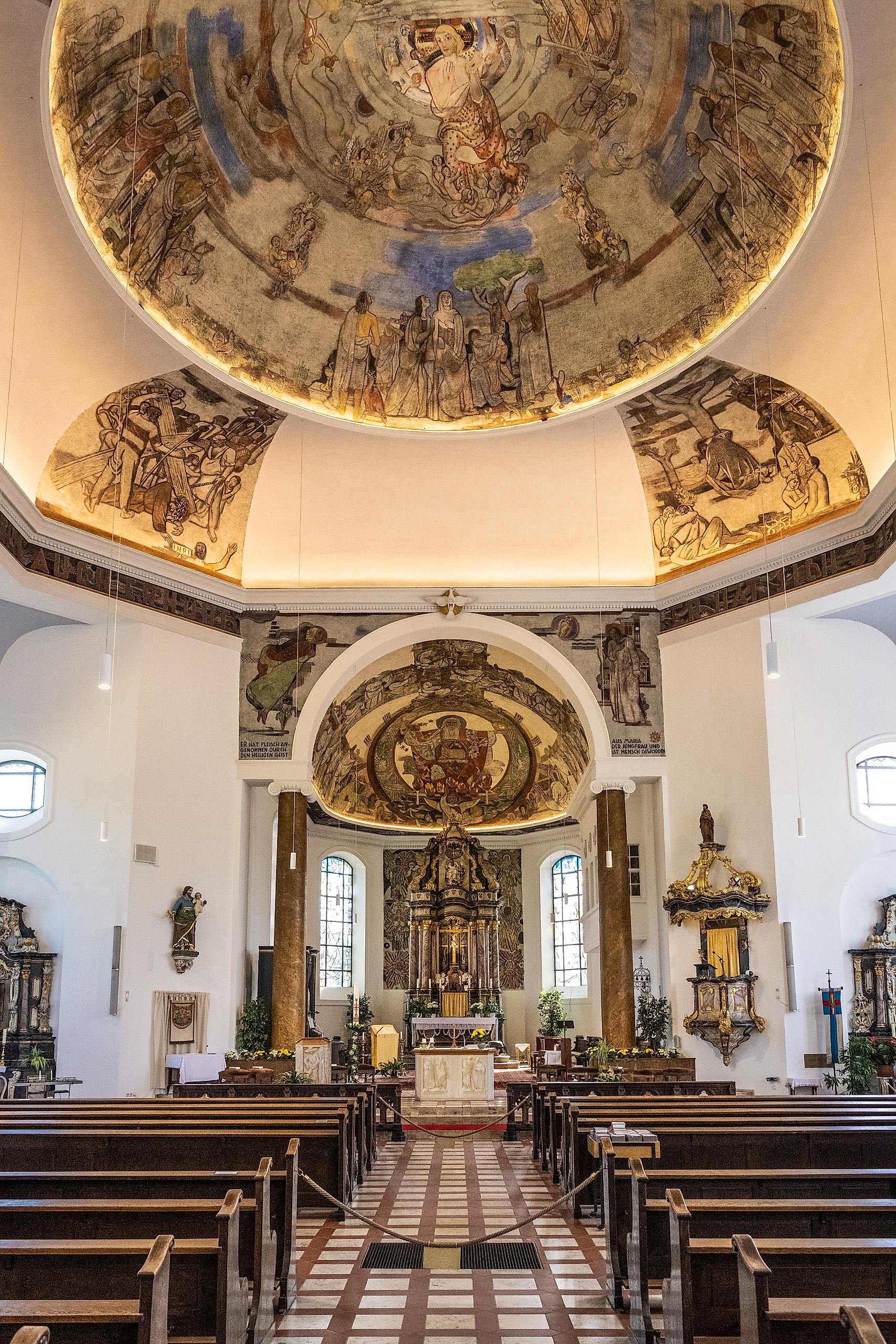 Anschließend geht es ins Innere der Kirche, die nach einem schweren Brand im Jahre 2023 aufwendig restauriert wurde. Die Deckenfresken des Dom-Malers Peter Hecker sind hier ein besonderer Höhepunkt.