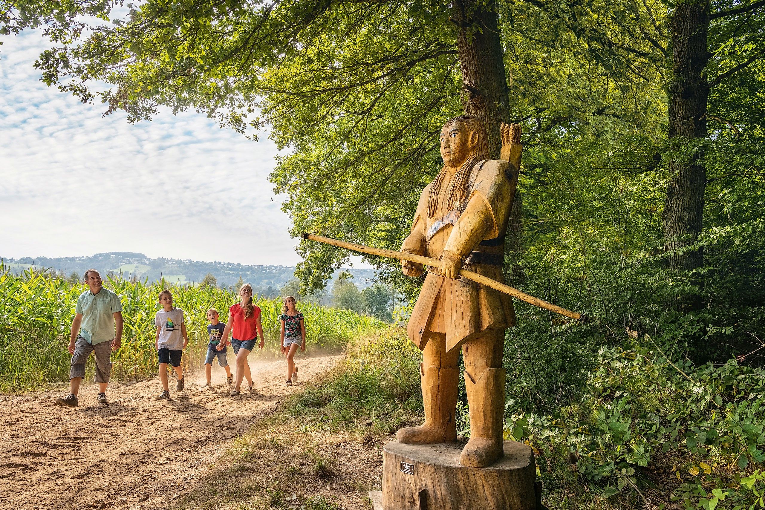 Die geheimnisvoll anmutenden Wälder und idyllischen Wiesenlandschaften rund um den kleinen Ort Blickhausen erinnern an das „Auenland“, die Heimat der Hobbits im Fantasy-Klassiker „Der Herr der Ringe“. Ihr wandert unter mächtigen Eichen auf urigen Pfaden und begleitet vom Plätschern des Firzelsbachs durch Wiesen und Auen. Auf dem Rundgang überraschen euch zahlreiche kunstvoll aus Holz geschnitzte Fabelwesen. Zauberer, Zwerge und Baummenschen erwarten euch am Weg. Durch mystische Wälder, über schmale Pfade oberhalb der Sieg und entlang weiter Wiesenlandschaften wandert ihr in einer Abenteuerwelt.