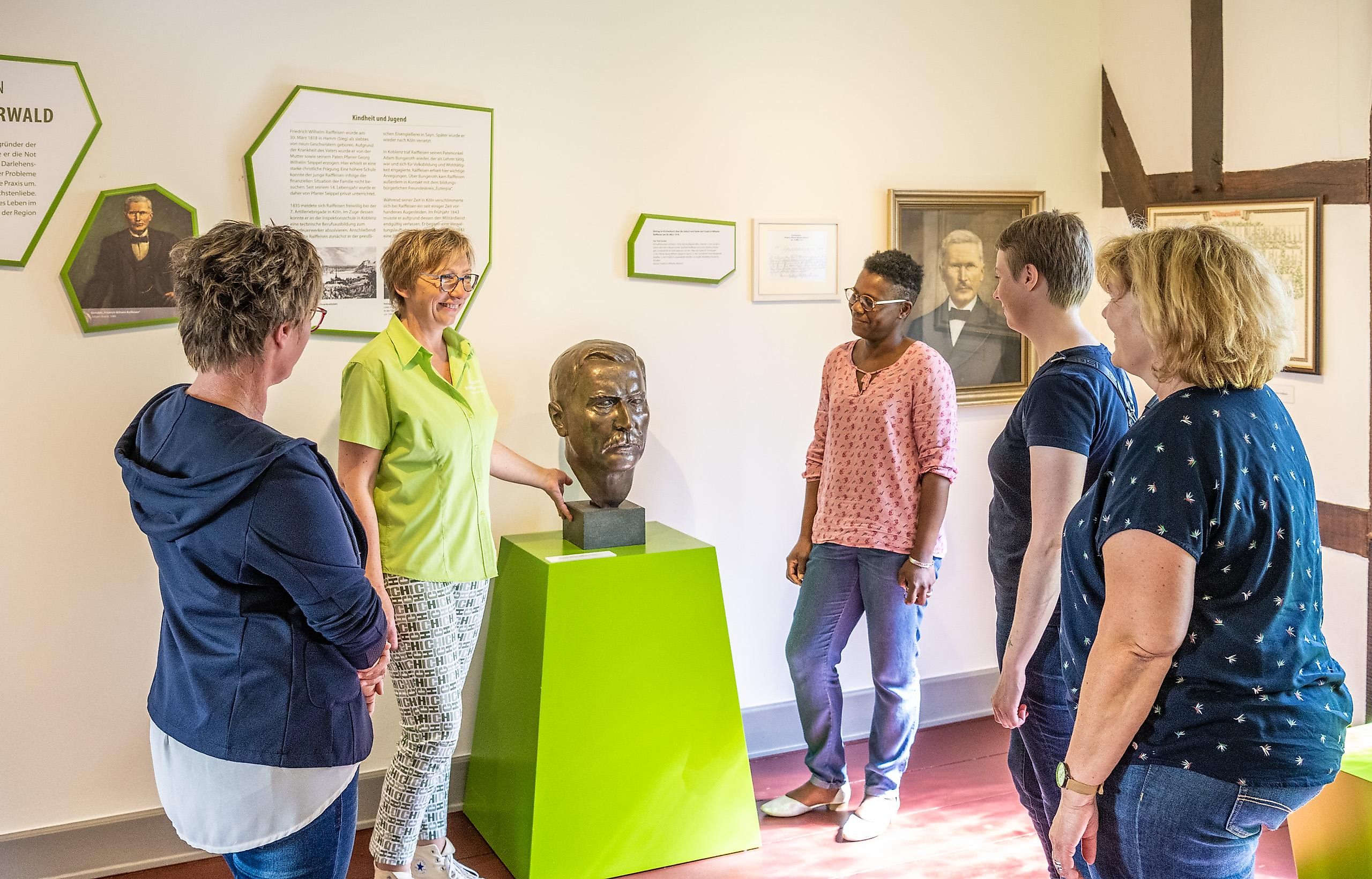 Der Rundgang beginnt im alten Verwaltungs- und Versammlungsgebäude mit seiner typischen Architektur, die ganz im Zeichen der Genossenschaftsidee steht: schlicht, funktional und gemeinschaftlich. Besucher begegnen historischen Kassenbüchern, frühen Bankplakaten, Darlehensregistern und alten Amtseinrichtungen – alles liebevoll erhalten und erklärt. Spezielle Ausstellungsräume widmen sich den Themen „Ländliche Not“ und „Solidarische Selbsthilfe“, wodurch der soziale und wirtschaftliche Hintergrund sichtbar wird.