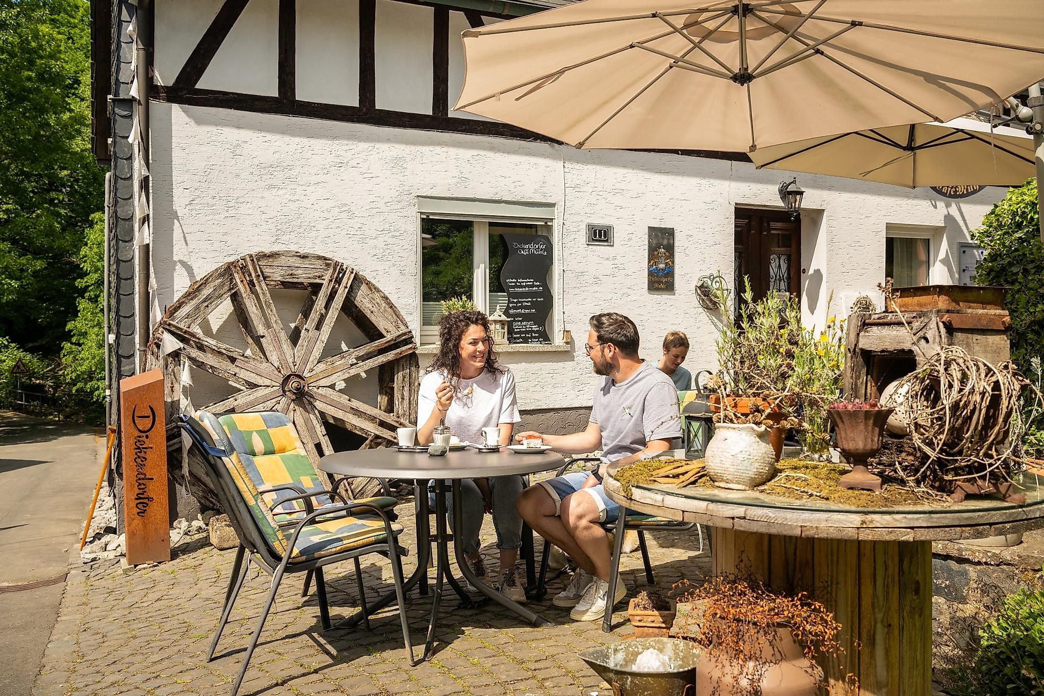 Im Elbbachtal führt dich der Wanderweg zur historischen Dickendorfermühle mit dem noch originalen Mahlwerk. Kehre hier ein und genieße ein leckeres, von den Besitzern selbstgemachtes, Stück Kuchen. Von hier aus beginnt der Aufstieg auf den „Weißen Gaul“ – hier wirst du weitere 100 Höhenmeter überwinden. Auf diesem Bergrücken führt der Druidensteig erneut in ein Erzbergbaurevier. Entlang des Weges finden sich wieder vermehrt Tagebauspuren und Reste von kleine Stollen.