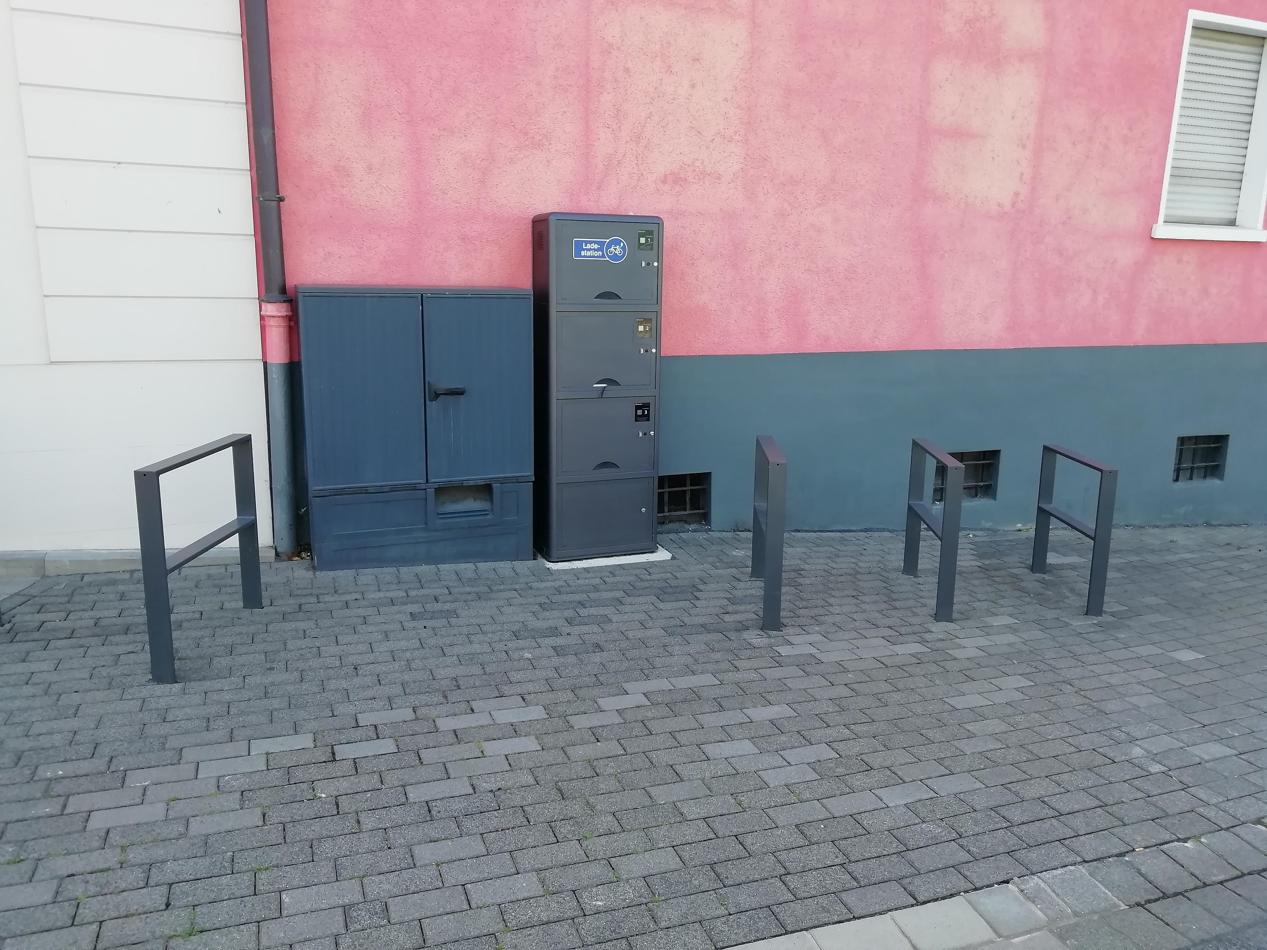Die Ladestation in Form eines Schrankes befindet sich direkt an der Kreuzung Rathausstraße/Bahnhofstraße vorm Haupteingang des Bahnhofes in Wissen.