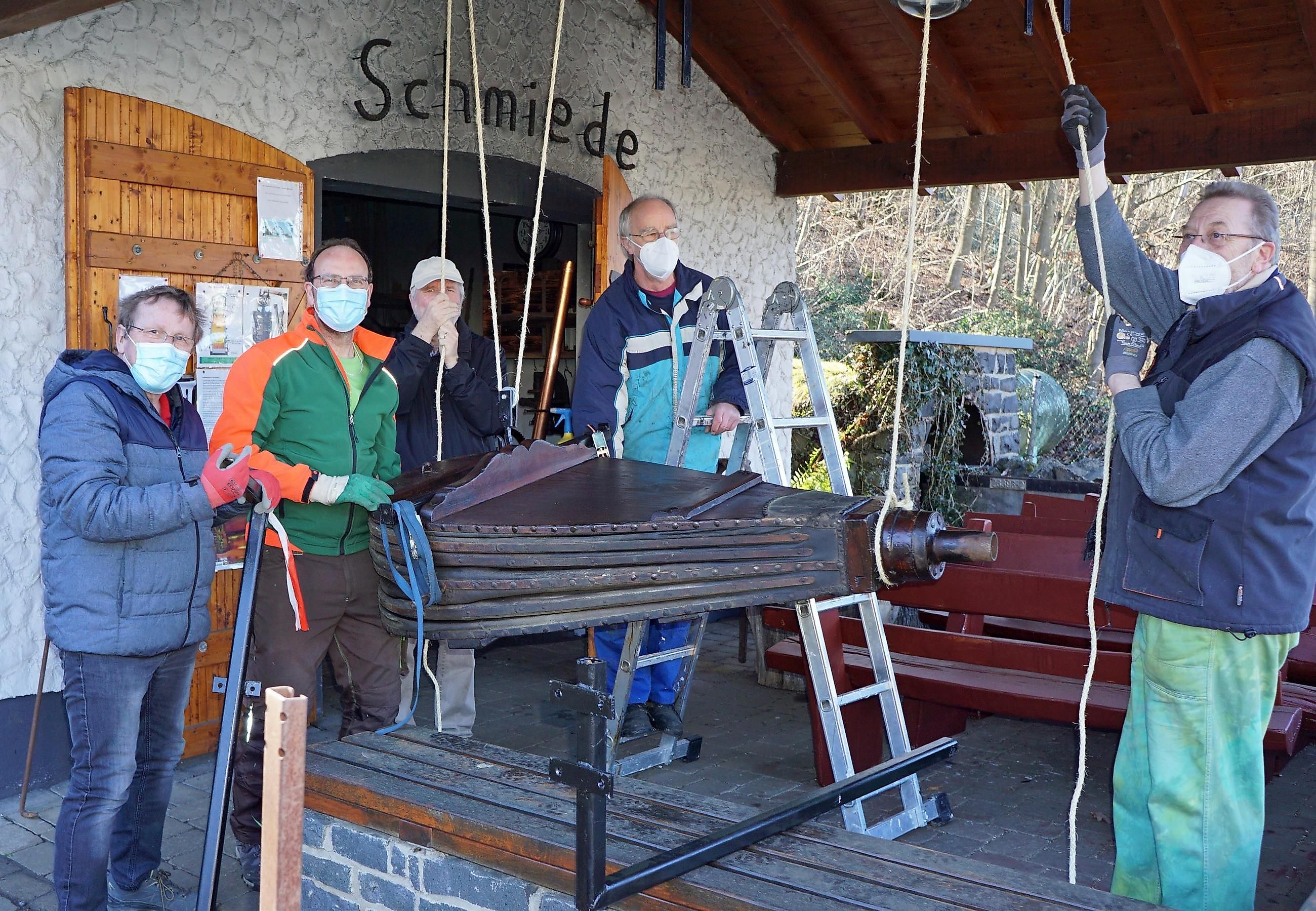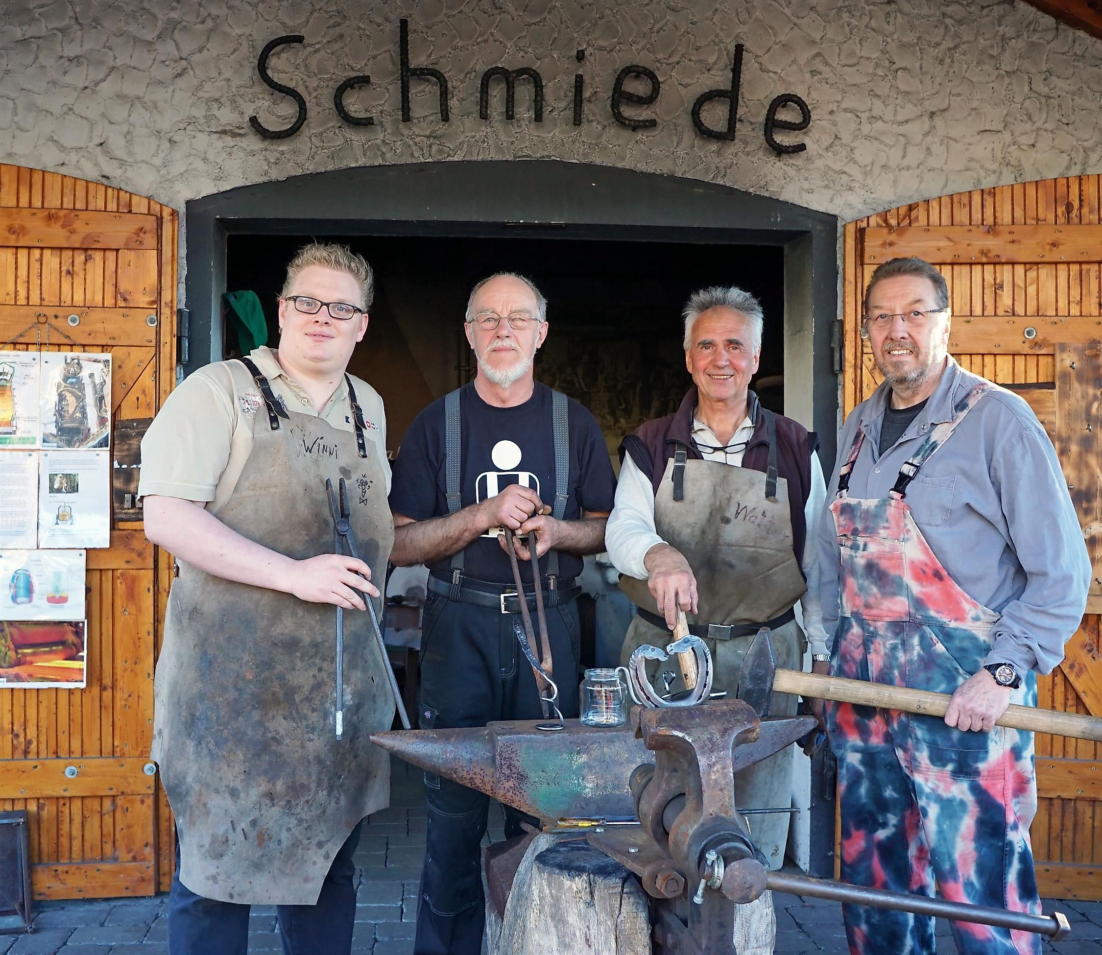 Der Geruch des Schmiedefeuers, das mit Steinkohle brennt, die Schläge mit den Schmiedehämmern auf die glühende Werkstücke aus Eisen, die auf dem Amboss bearbeitet werden – das ist die Atmosphäre eines besonderen Live-Erlebnisses. Die Grubenschmiede im Außenbereich des Besucherbergwerks Grube Bindweide in Steinebach/Sieg bietet eine weitere Attraktion für Besucher*Innen jeden Alters. Sie ergänzt seit 2014 das Thema Eisenerzbergbau um die Ver- und Bearbeitung des daraus hergestellten Eisens und Stahls. Unser engagiertes Schmiedeteam freut sich, dieses alte Handwerk lebendig zu halten und ihr Publikum mit ihrem Können zu begeistern. So entstehen eine Vielzahl von beliebten und nützlichen Produkten, wie die Sternzeichen, glücksbringende Hufeisen, Flaschenöffner und Grillgabeln bis hin zu verschlungenen Herzen – unvergängliche Andenken an einen Erlebnistag im Bergwerk und an der Grubenschmiede.Diese neue Schmiede folgt einer langen Tradition. Unweit des heutigen Standorts, dort wo jetzt die Barbarakirche steht, befand sich die historische Grubenschmiede, in der Werkzeuge und Eisenwaren für das Bergwerk hergestellt oder repariert wurden. Neben der Standard-Schmiedevorführung können weitere Angebote gebucht werden: Schmiede-Workshops, sowie Kinder- und Familienschmieden, Pärchen-Schmieden. Ein alter, liebevoll restaurierter Blasebalg ist ein seit der Saison 2021 ein Blickfang. Mit dem funktionsfähigen Blasebalg kann man einen kräftigen Luftstrom erzeugen, gleichsam frischer Wind für die Grubenschmiede. Früher sorgte der Luftstrom aus dem Blasebalg für die richtige Temperatur des Schmiedefeuers – heute erledigt das ein elektrisches Gebläse.