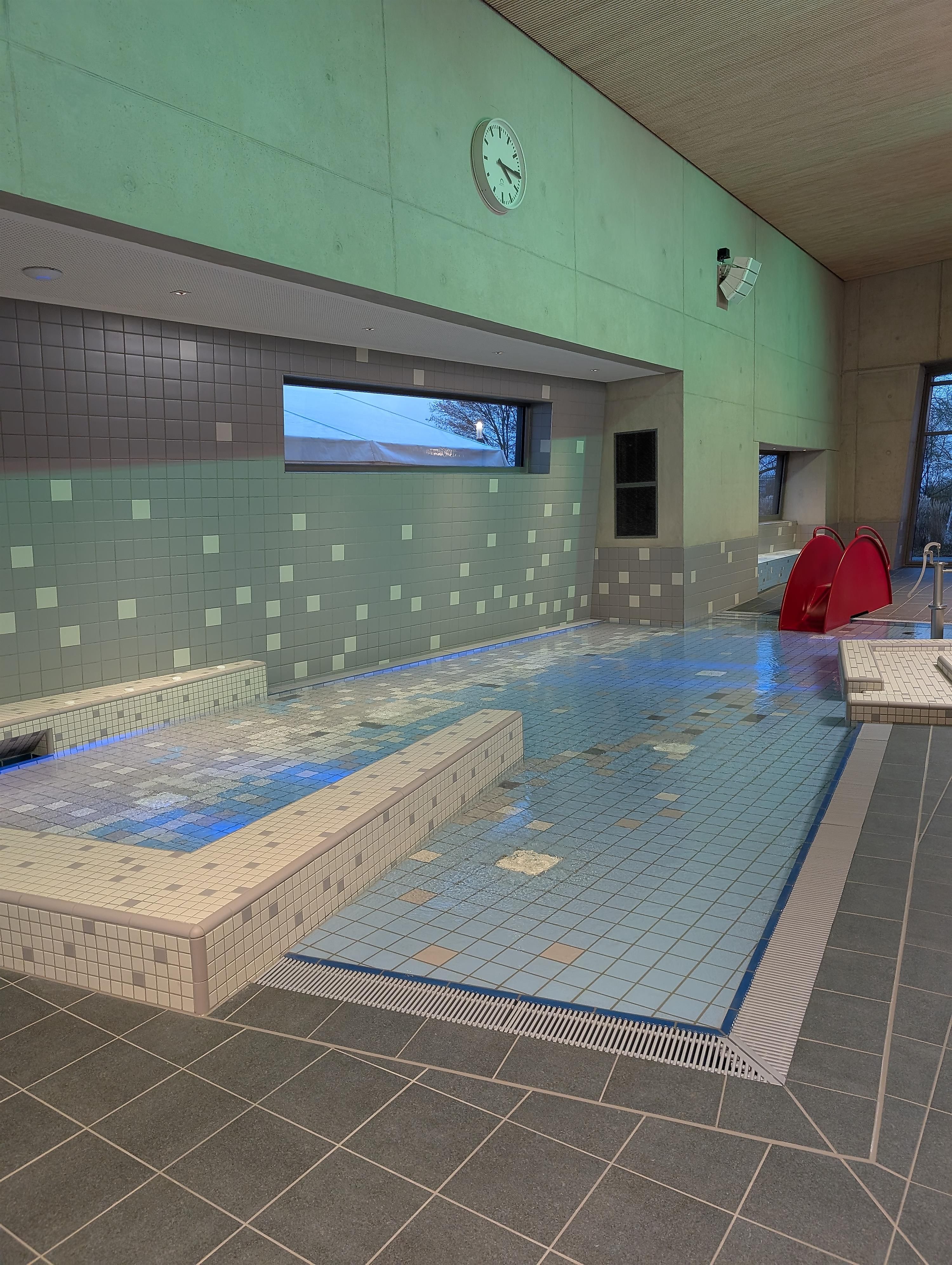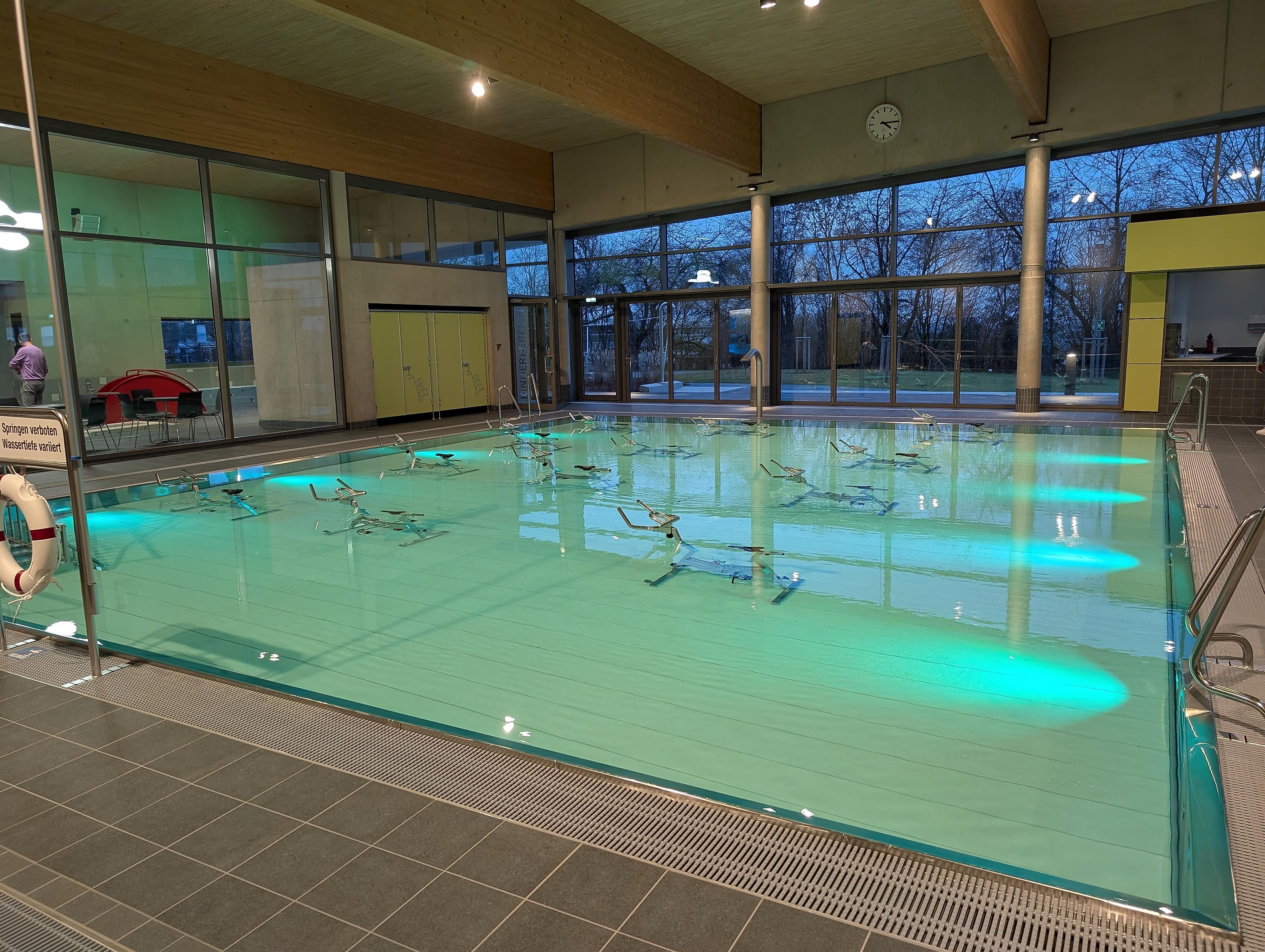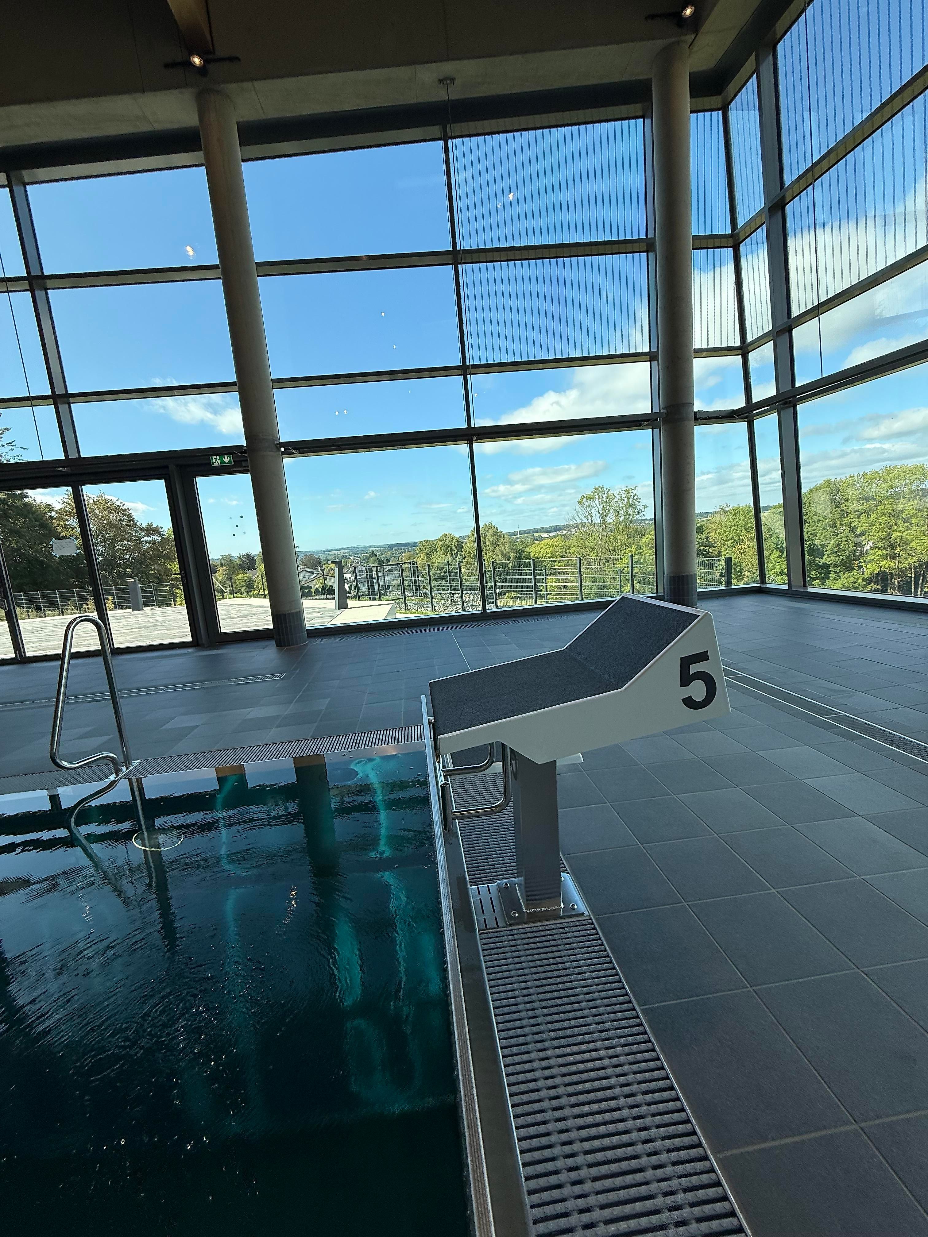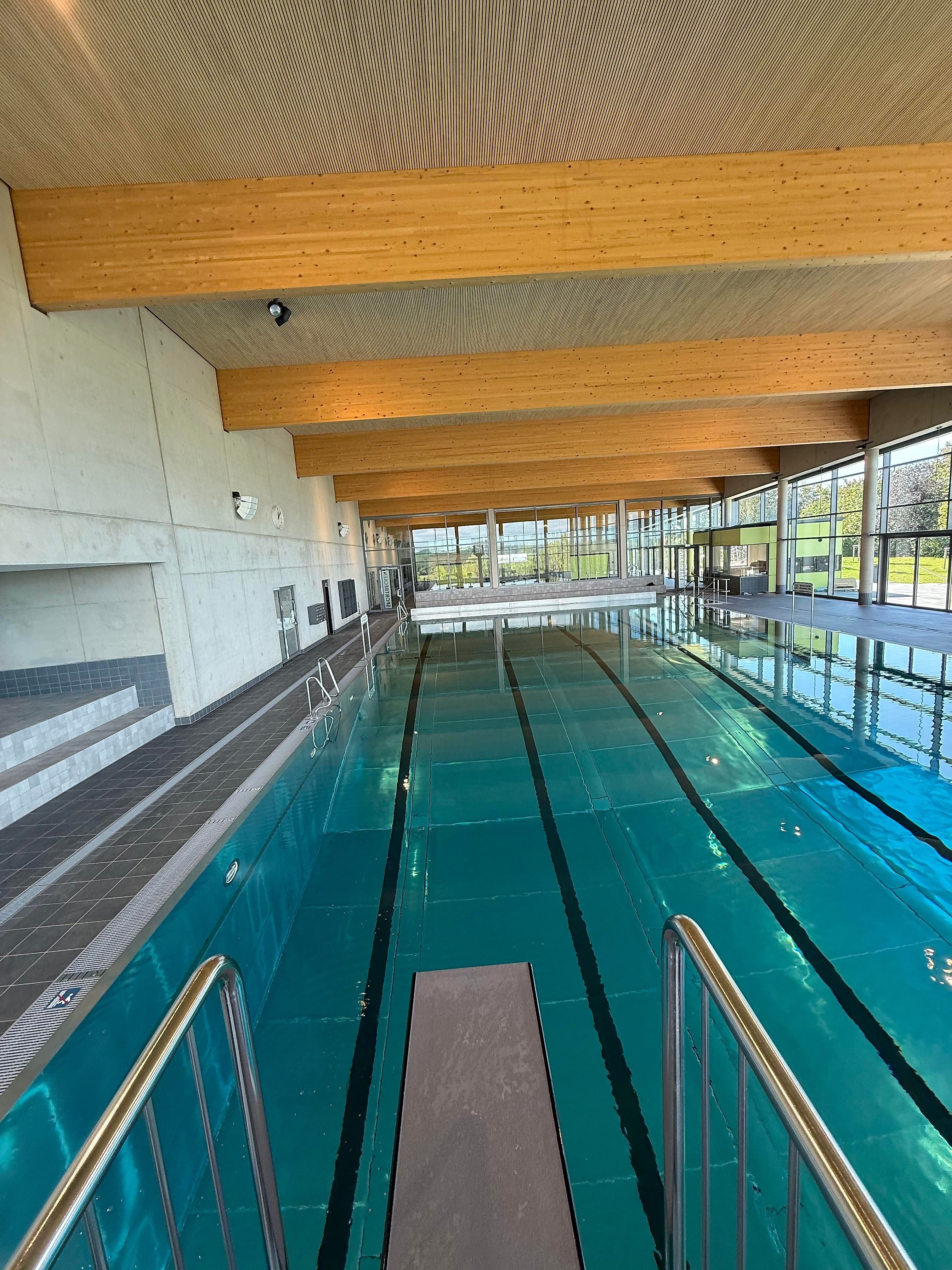 Das neue Hallenbad verfügt über ein Sportbecken mit fünf 25-Meter-Bahnen, ein Ein-Meter-Sprungbrett und eine Drei-Meter-Plattform. Ergänzt wird das Angebot durch ein Mehrzweckbecken sowie ein separates Planschbecken für Kinder. Eine großzügig zu öffnende Glasfassade ermöglicht in den Sommermonaten den direkten Zugang zur Liegewiese und Terrasse, die bei schönem Wetter ideal zum Entspannen einlädt.