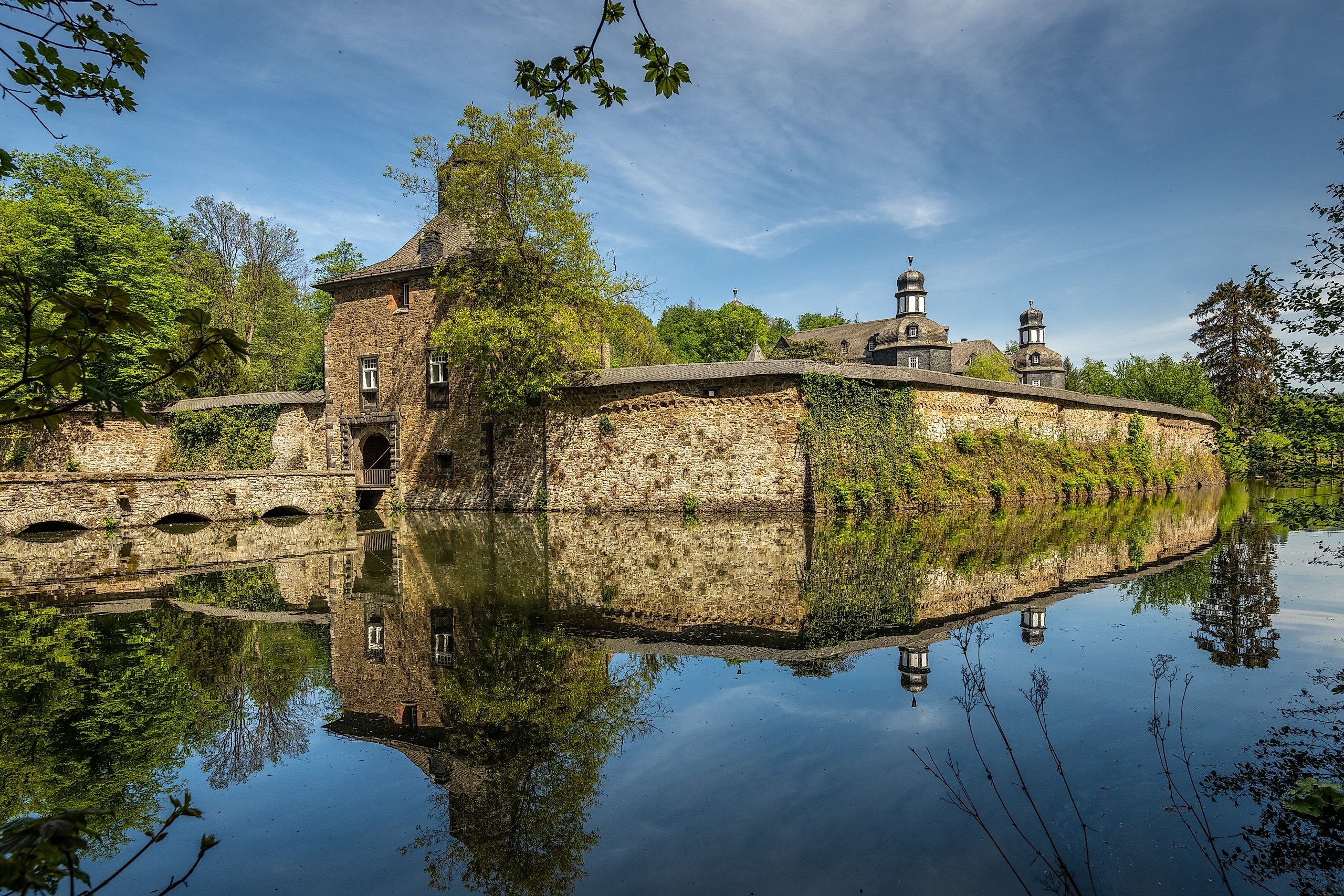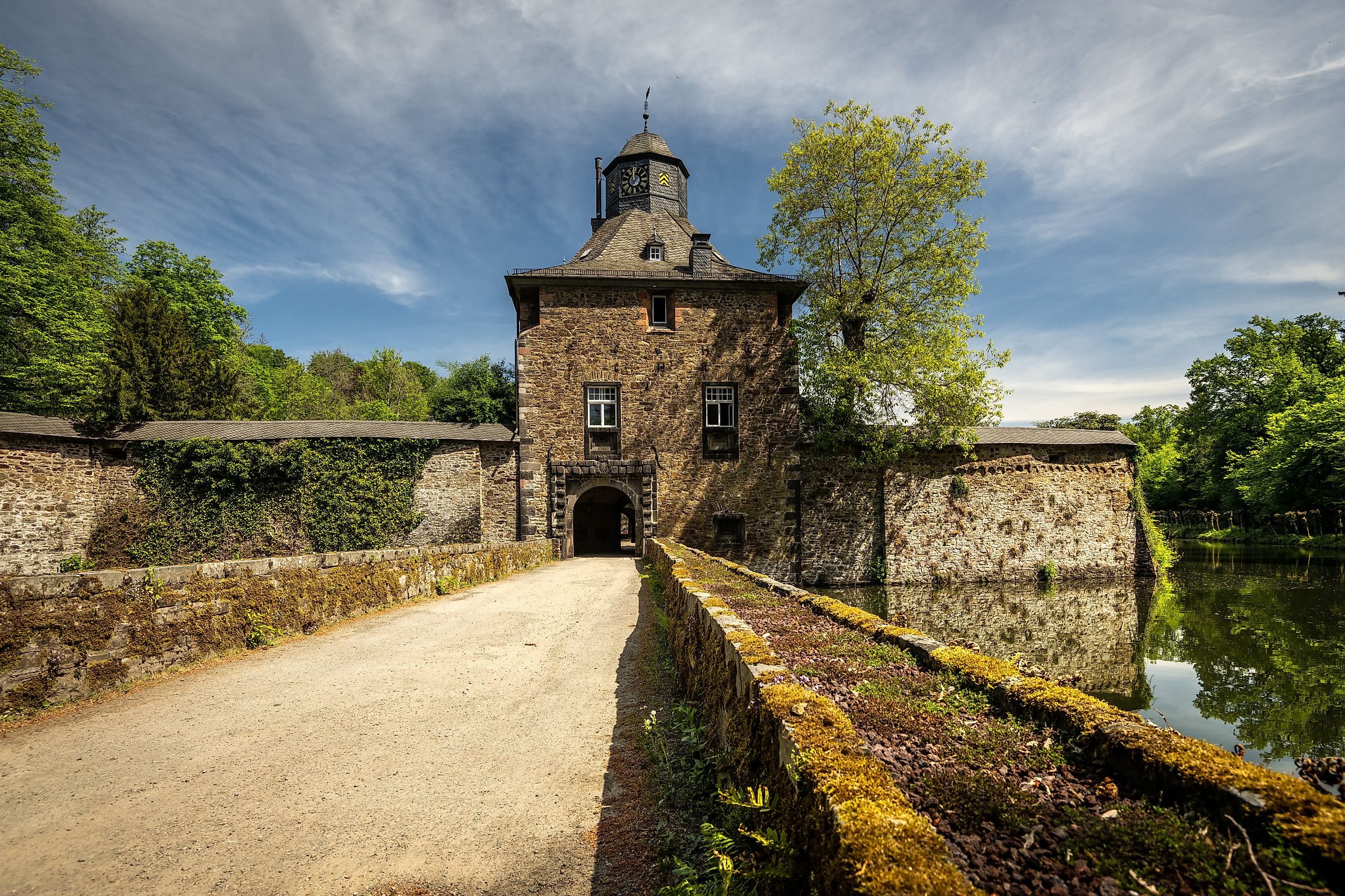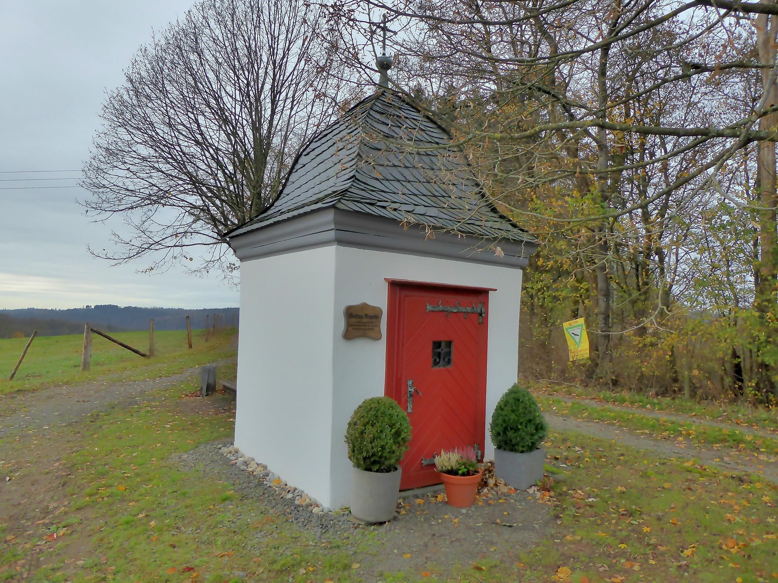 Von den Parkplätzen am Sportplatz in Friesenhagenführt euch die rot-weiße Erlebnisweg-Markierung desHexenweges zunächst die Klosterstraße bergab zurBarockkirche St. Sebastianus. Weiter geht es durchden Ort und ein kurzes Stück entlang der Hauptstraße.Ein Abzweig führt euch vorbei an Kreuzwegstationendurch den Wald zur Kreuzkapelle auf dem Schnabelberg.Zurück auf dem Hexenweg folgt ihr einem schönenPfad entlang des denkmalgeschützten WasserschlossCrottorf. Es ist in Privatbesitz und gilt als einesder schönsten und besterhaltenen Wasserschlösserim Rheinland. Bevor ihr den Wildenburger Bach überquert,wartet noch eine literarische Überraschung: Ineiner Höhle hat sich hier die amerikanische Konzept-künstlerinJenny Holzer mit einem Gedicht verewigt.Ihr geht weiter am Wassergraben entlang, überquertdie Straße, vorbei am Landgasthof Wildenburger Hofund ab hier ein Stück steil bergan in die Wälder rundum Friesenhagen. Nach kurzem Aufstieg eröffnet sichein breiter, gut begehbarer Forstweg. Eine asphaltierteStraße führt euch über den Nädringer Bach, anschließendschlängelt sich ein uriger Feldweg am Waldrandauf den Rollsberg. An der Rochuskapelle lädt derweite Ausblick zur Rast ein. Mit Blick auf die Wildenburggeht ihr über ein stilles Sträßchen hinunter insTal. Den Wildenburger Bach überquerend, gelangt ihrauf einem sanft ansteigenden Waldweg nach Ziegenschlade.Nun ist es nur noch ein Katzensprung hinaufzum Blumenberg und der Roten Kapelle, die um 1690zum Gedenken an die Wildenburger Hexenprozesseerbaut wurde. Die über 400 Jahre alte „Hexenlinde“wurde im Jahr 2021 von einem Sturm zerstört. Über einen Wiesenweg des so genannten Blumenbergs erreicht ihr zunächst die Straße „Zur Linde“ und direkt anschließend wieder euren Ausgangspunkt am Sportplatz.