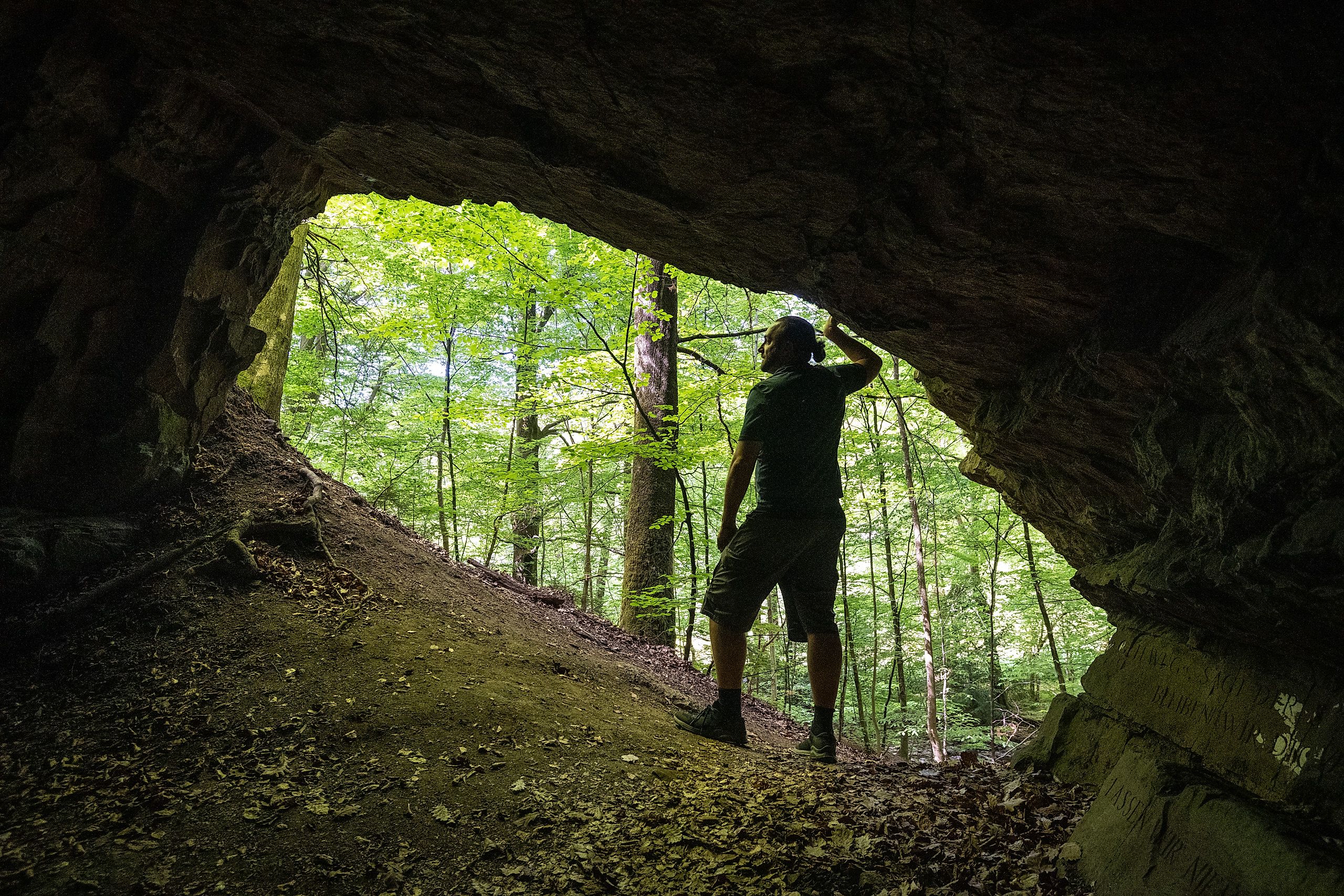 Installation der Konzeptkünsterin Jenny Holzer in einer Höhle am Wildenburger Bach in der Nähe von Schloss Crottorf.