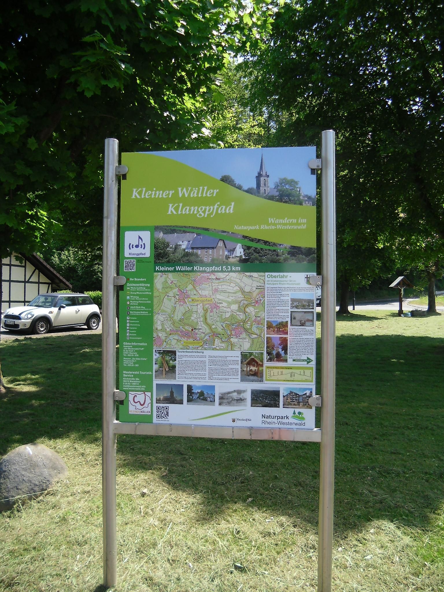 Vom Wanderparkplatz aus laufe ich an der alten Eiche und am alten Dorfbackes vorbei und zwischen Wiesen und Ackerflächen hindurch hinab ins Wiedtal. Die Klangwiege bewegt mich zur ersten Pause und ich lasse meinen Körper von den Harfentönen durchdringen. Dann geht es weiter am Stolleneingang der Grube Silberwiese vorbei nach Oberlahr. Hier mache ich einen Abstecher zum historischen Dorfplatz mit neugotischer Kirche, einem alten Pfarrhaus, dem Dorfbackes und einigen alten Fachwerkhäusern.Über die Langenauer Straße führt mich der Klangpfad vorbei an ehemaligen Fabrikationsgebäude der Erzgrube "Silberwiese", wieder über Waldwege nach Rott zurück, vorbei an Fischweihern und weiteren Klanginstrumenten. Ältere Infotafeln eines ehemaligen Naturlehrpfades ergänzen meinen Weg, so dass ich gut informiert und wohlklingend gestimmt schon bald wieder meinen Ausgangspunkt an der alten Eiche Rott erreiche.