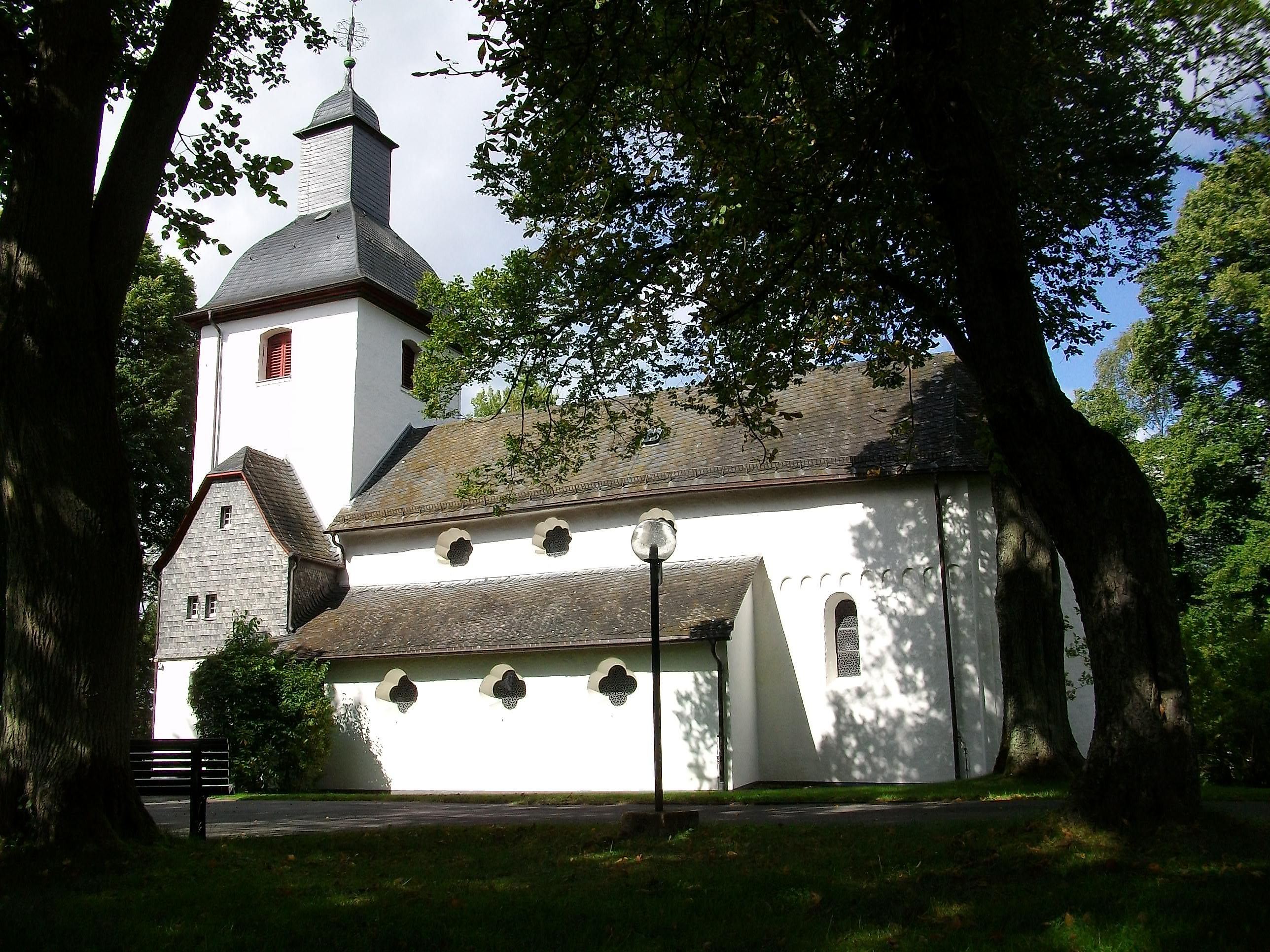 Spätromanische, flachgedeckte Pfeilerbasilika aus dem zweiten Viertel des 13. Jahrhunderts mit noch erhaltenen Freskenmalereien; Lage: umgeben von altem Baumbestand - auf einem vorspringenden Bergrücken über dem Wiedtal in Almersbach.