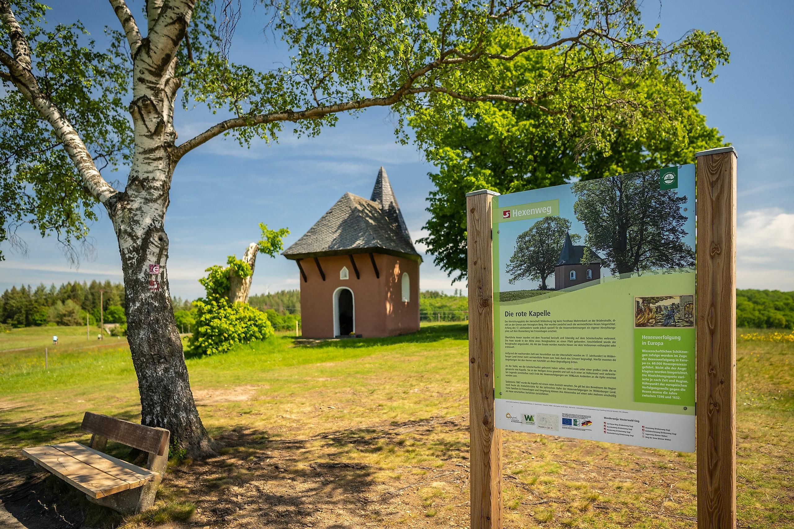 Die Sankt Anna Kapelle, auch bekannt als rote Kapelle, wurde Ende des 17. Jahrhunderts errichtet und erinnert an die Zeit der Hexenprozesse und Hinrichtungen im Wildenburger Land in der ersten Hälfte des 17. Jahrhunderts. Neben ihr stand eine ortsbildprägende Linde, die rund 400 Jahre alt war und leider im Jahr 2021 einem Sturm zum Opfer fiel. Über diese Anhöhe des sog. Blumenberg verläuft der knapp 8 km lange Hexenweg, ein Erlebnisweg in der Naturregion Sieg im Druiden.Hexen.SiegerLand der Verbandsgemeinde Kirchen (Sieg).