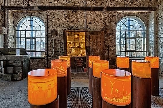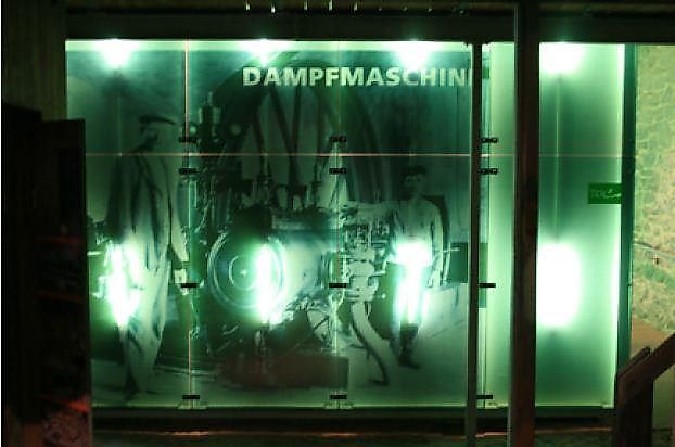 Erlebnisraum Historische Werkstatt Die Alte Schmiede ist ein ganz besonderes Gebäude. Sie war im 20. Jahrhundert das Herzstück des Betriebs und ist heute, nach der sensiblen, historiengetreuen Renovierung, wieder ein Schmuckstück mit Erlebnischarakter. Auf einer Ausstellungsfläche von rund 325 Quadratmetern wird Industriegeschichte an vielen verschiedenen Stationen lebendig und begreifbar. Türe und Schränke laden zum Öffnen ein und die sprechende Mülltonne erzählt so manche Episode. Und hier wird samstags gerne (teils privat) gefeiert oder einem Konzert gelauscht. Erlebnisraum Schalthaus und Café KohleschuppenDa wo einst eine riesige Dampfmaschine das gesamte Werk mit Energie versorgte, erleuchten heute Informationen zum Thema Energie das ehemalige Kesselhaus. Hinter der grünen Fassade sind die WCs zu finden. Das typische Geräusch der alten, riesigen Maschine ertönt jedoch noch heute.
