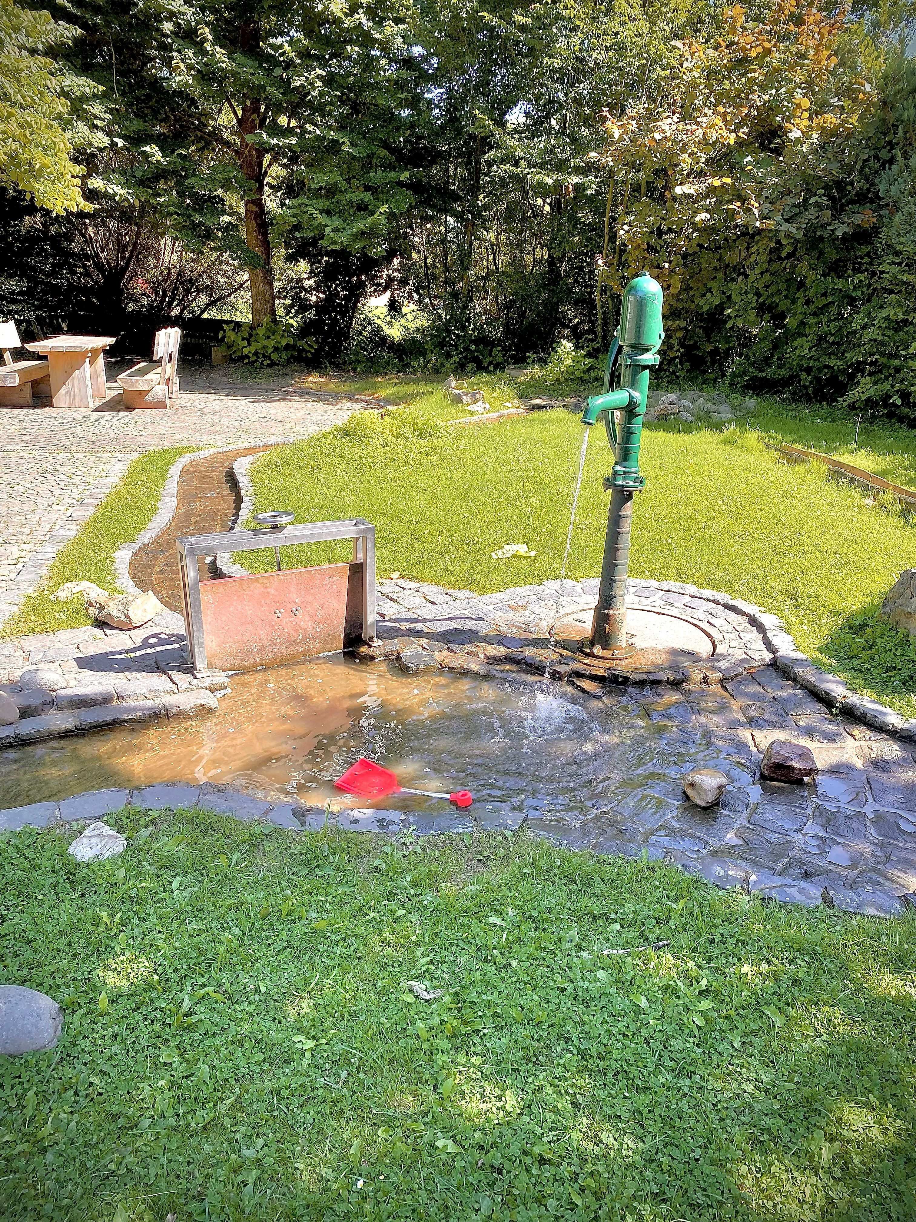 Mit der Wasserpumpe können die Kinder nach Herzenzlust Wasser aus der Tiefe pumpen, so wie es früher vor den Häusern oder auf dem Dorfplatz noch üblich war. Eine drehbare, höhenverstellbare „Staumauer“ lässt die Kinder mit dem kühlen Nass herrlich spielen. Der große steinerne Wasserbrunnen, die Stein- und Holzrinnen bieten herrlichen Spaß für kleine und große Besucher.