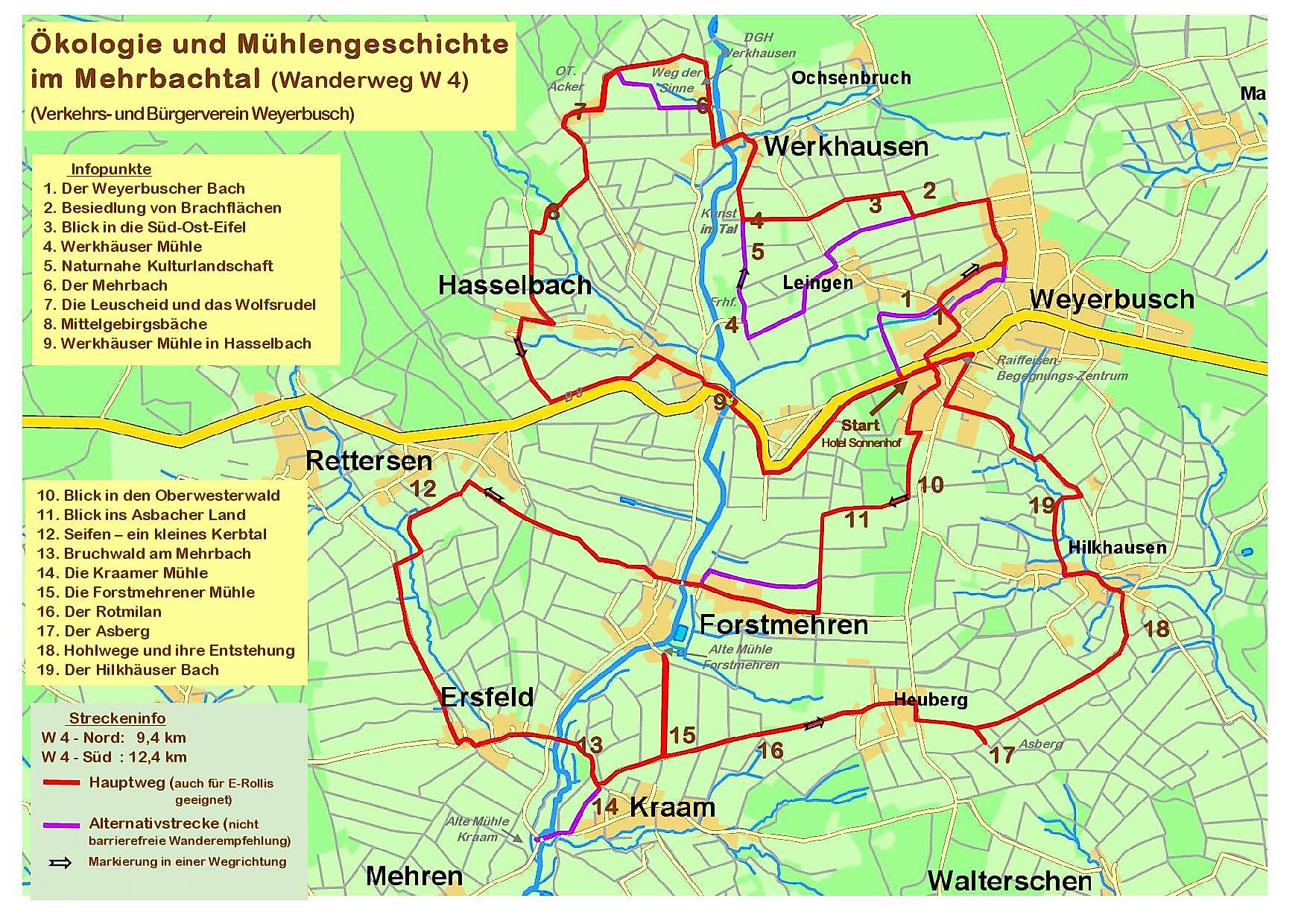 The barrier-free cycling and hiking trail "W 4 North" (9.4 km) and "W 4 South" (12.4 km) inform me about the eventful mill history and ecology of the upper Mehrbach valley and explain the panoramic views visible on this route. All information, pictures, and audio files can be found on the 19 information boards via QR code. Carrying a smartphone is therefore required here to learn more about the region and the wonderful views.The target groups include hikers, cyclists, and e-bikers as well as people exploring nature with a robust electric wheelchair or those who are visually impaired. It is only signposted in one direction so that gravel paths appear only downhill. The route was previously tested with an all-terrain wheelchair with an auxiliary motor, and minor obstacles were cleared. At the most beautiful spots, seating areas invite me to take a short break repeatedly.
