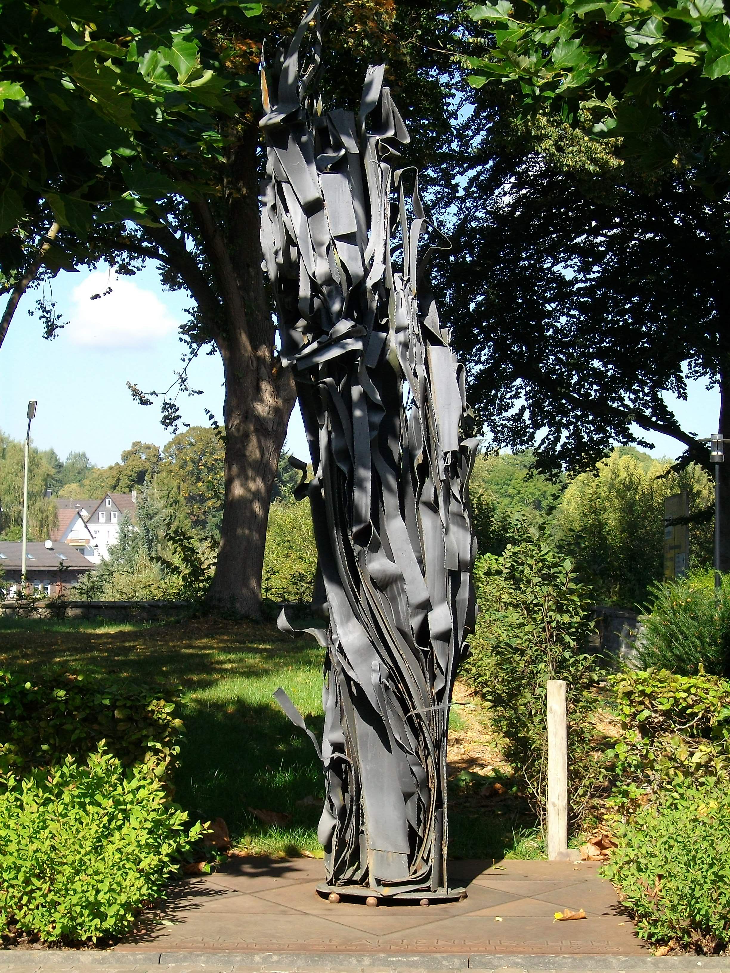 We passeren het "Historisches Quartier", een plaats voor het behoud van de geschiedenis van de stad, en aan het einde van de "Wallstraße" / "Im Hähnchen" vinden we nog een oude straathoeksteen op de grond, vroeger een bescherming tegen stoten voor de paardenkarren. Verderop leidt de Saynstraße ons naar de Schlossplatz aan de linkerkant.Links vinden we een afbeelding van het voormalige kasteel op een elektriciteitskastje. De gebouwen werden echter verwoest door grote branden en oorlogsgebeurtenissen.We steken het plein over in de richting van de kerk en zien links het vlammenmonument ter nagedachtenis aan de synagoge en de Joodse medeburgers die het slachtoffer werden van de Holocaust.
