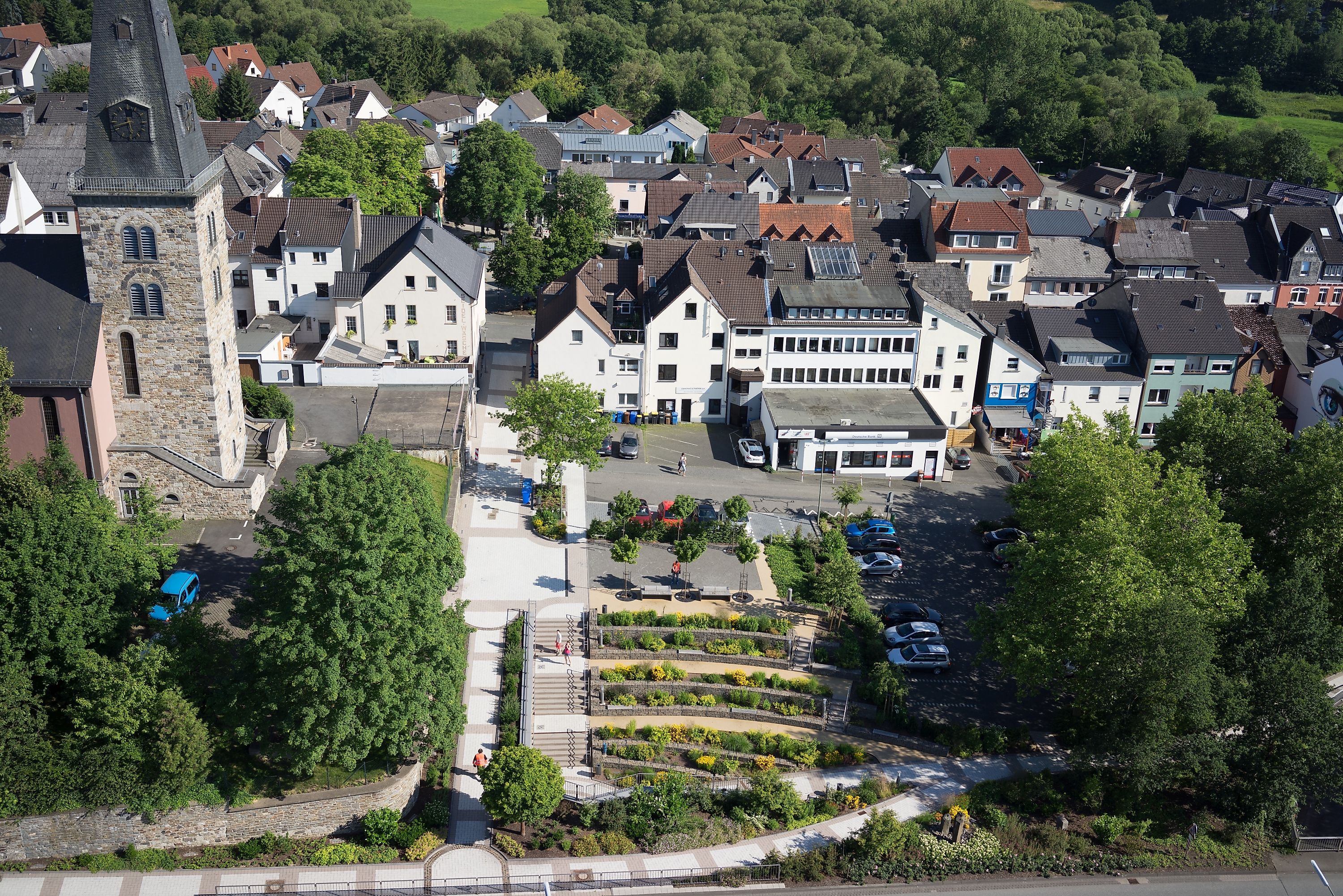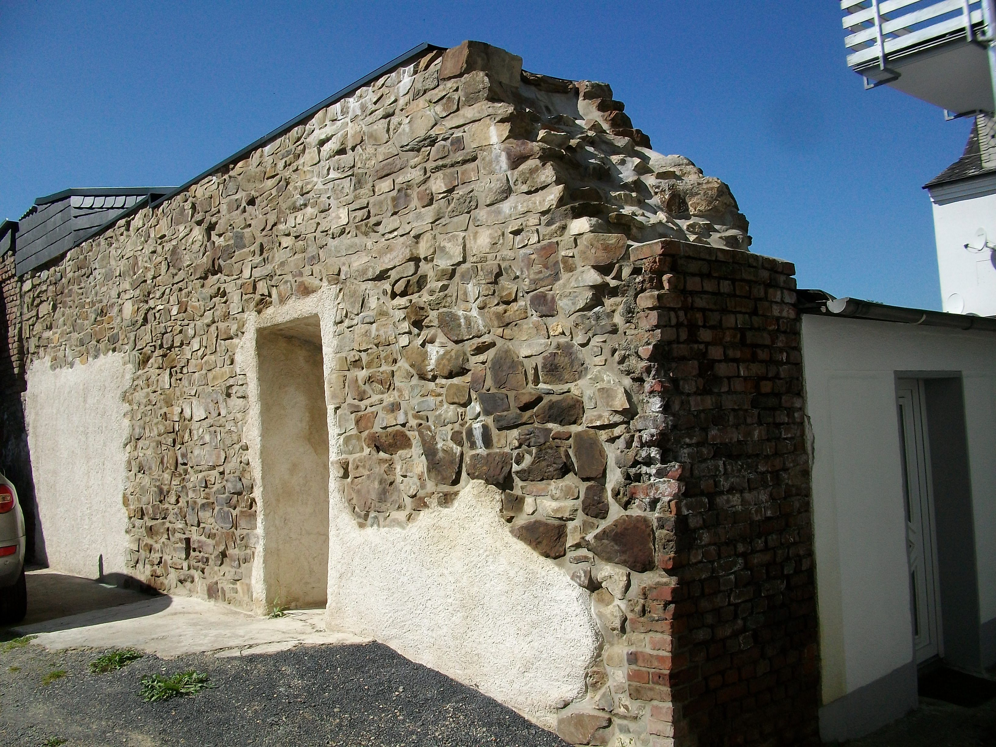 Het marktplein werd enkele jaren geleden heringericht, en aan het uiteinde vinden we een leistenen gebouw dat waarschijnlijk het oudste huis van de stad is (1602). We gaan nu de Kirchstraße in, steken de liefdevol vormgegeven Kirchplatz over en steken het zebrapad over om bij de overblijfselen van de oude middeleeuwse stadsmuur te komen, die veel gezien moet hebben als huis-, stal- of zelfs garagemuur.