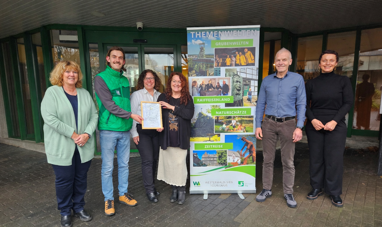 Bildunterschrift Foto Verbandsgemeinde Altenkirchen-Flammersfeld: Gabi Wäschenbach, Landkreis Altenkirchen, Regionalentwicklung, Oliver Filby, Westerwald Touristik-Service, Angela Metzen und Martina Beer, Tourist-Information, Bürgermeister Fred Jüngerich und Rebecca Seuser, Fachgebietsleitung Kultur, Tourismus und Ehrenamt